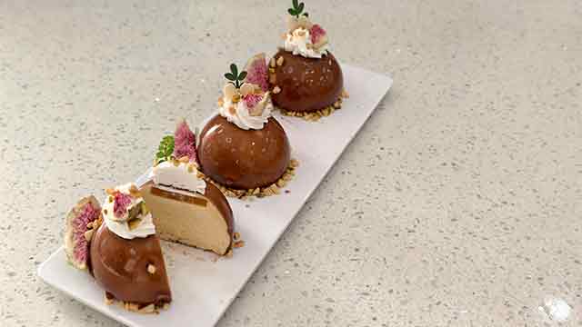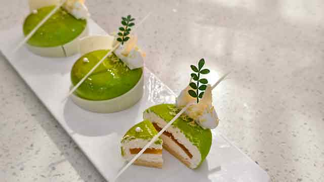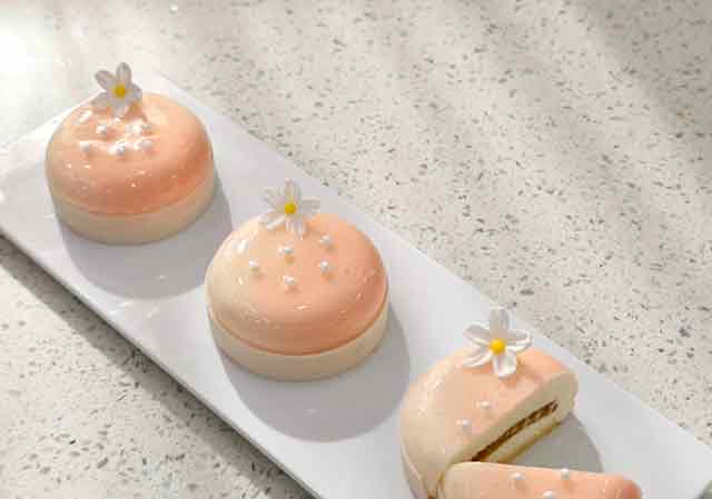 步入展臺現(xiàn)場,數(shù)十款法式慕斯甜品錯落陳列,瞬間讓人仿佛置身巴黎街頭的精致甜品店。鏡頭拉近,淋著鏡面釉的慕斯蛋糕最為吸睛——深咖色的歌劇院慕斯泛著綢緞般的光澤,輕輕晃動便折射出細膩光影;淡粉色的草莓慕斯表面,新鮮草莓片與薄荷葉錯落點綴,顏值與清新感兼?zhèn);還有融合了當(dāng)下流行元素的低糖抹茶慕斯,淺綠底色搭配金色糖針,簡約又高級。每一款作品都層次分明,切開后可見細膩的慕斯體、醇厚的夾心與酥脆的餅底,一口下去的豐富口感,藏著對法式甜品工藝的極致追求。