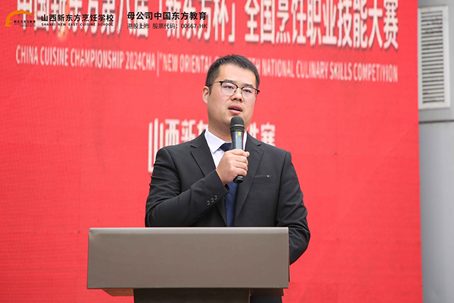 山西新東方烹飪學校教務負責人做賽事安排:“這是山西新東方烹飪學校悉心打造的烹飪盛會,對于參賽選手們而言,這將是一次難得的以廚藝論英雄,以技能展風采的學習交流機會,希望各位參賽選手嚴格按照比賽制度,賽出水平賽出成績。”