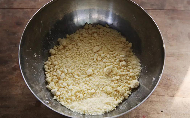 ② 冷藏的黃油切成小塊,并加入低筋面粉中,接著用手搓成玉米粉的狀態(tài),注意不要讓黃油融化。