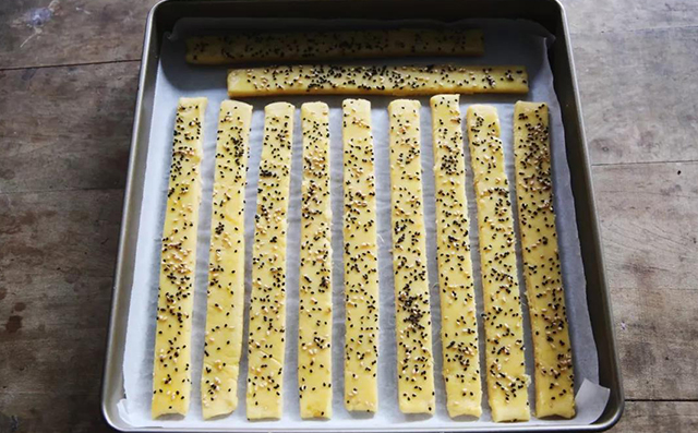 、 蛋黃加水混合,刷在面片上,再均勻地撒上黑白芝麻,切成長條。最后以 170℃ 的溫度烤 25 分鐘,拿出,搞定!