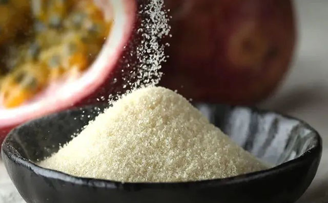 HM果膠,通常是粉末狀,不溶于冷水、難溶于熱水、易溶于沸水,果膠可以在高酸度(PH2.5以下)和高糖度。