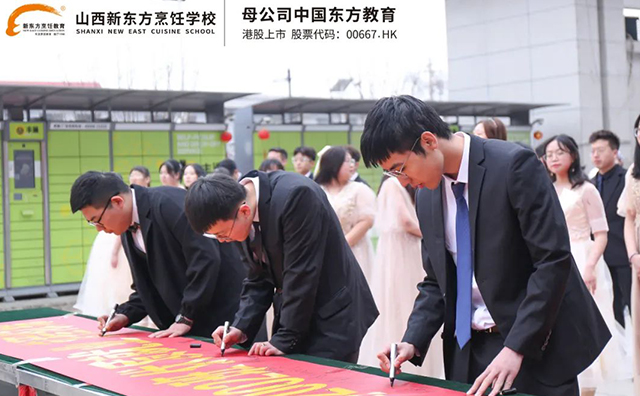 凡是落幕,皆為序章。典禮最后,畢業(yè)學(xué)子與老師,紛紛在簽字板上簽字,烙下屬于自己的獨(dú)特印記。就此,他們?cè)谏轿餍聳|方的學(xué)習(xí)和生活畫(huà)上圓滿的句號(hào)。在學(xué)校創(chuàng)就業(yè)指導(dǎo)中心的安排下,他們即將奔赴工作崗位,將踏上新的征程,從學(xué)生到烹飪大廚,迎接他們的是一段全新的人生旅程。