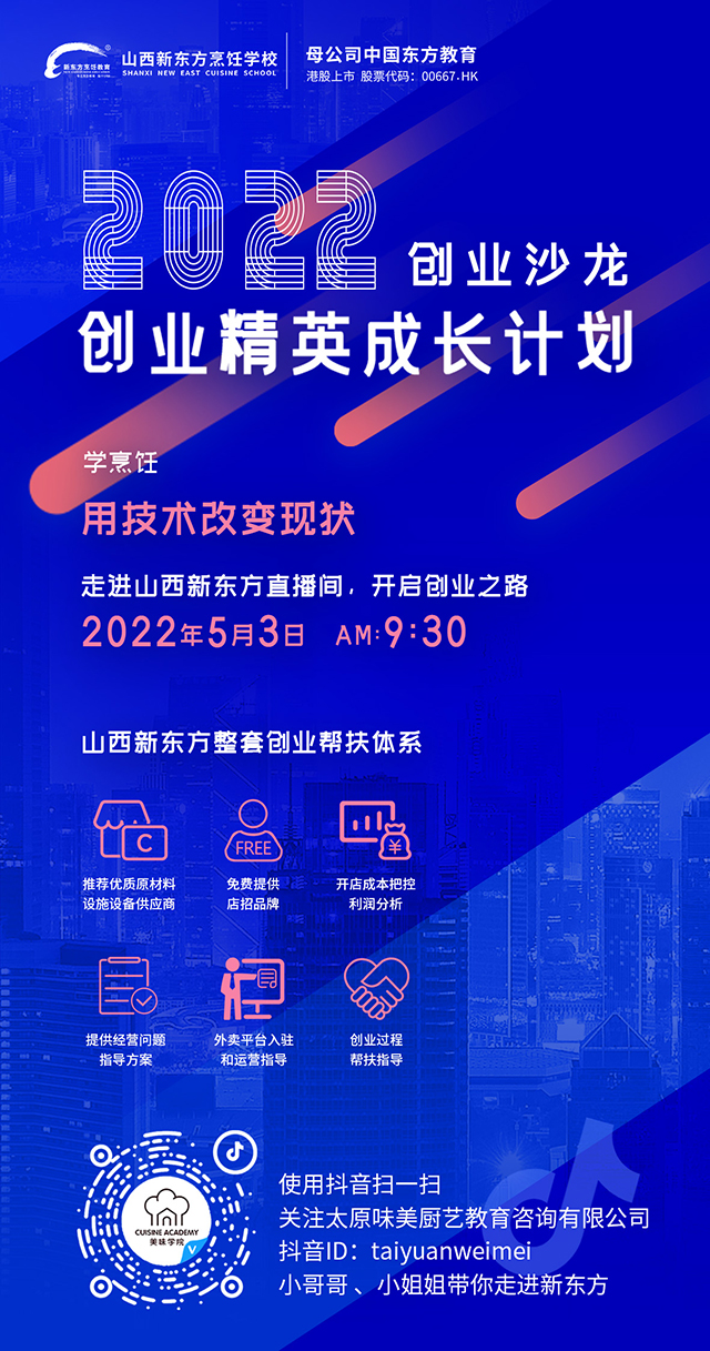 創(chuàng)業(yè)正當時!當你永遠在等的時候,就是在一次次的錯過機會。人生有輸有贏,關(guān)鍵是要邁出去第一步。把握機會,趁早入場,搶占先機!雖然疫情還未完全結(jié)束,不少餐飲門店尚未恢復疫前的經(jīng)營水平,但是對于創(chuàng)業(yè)者而言,正好抓住這個窗口期,選址、裝修、學習技術(shù)。五一小長假,宅家不躺平,一起來參加創(chuàng)業(yè)美食沙龍吧~